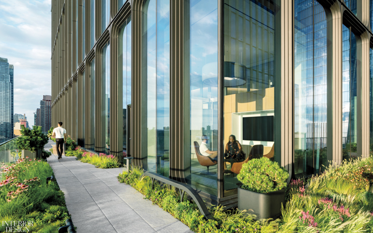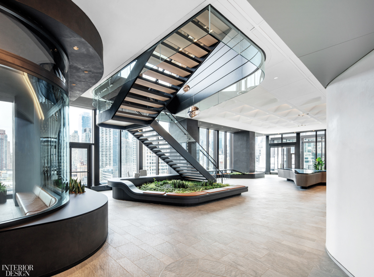 A+I proposed treating the new digs like a vertical campus, using internal staircases to link the floors, which would be served by a single entrance opening onto a signature reception space—a common ground and pivot point whose location in the stack was easily determined: the 10th floor, where the high-rise steps back, creating an inviting wraparound terrace that would not only extend the reception area outdoors but also allow people to walk laps around the entire building.