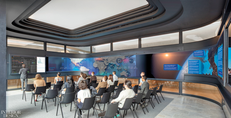 Comfort levels are complemented by amenities that might be expected in a top-rated hotel’s public areas. The lounge offers barista service and a wall of healthful snacks and drinks on tap. On the far side of the presentation pavilion—a glazed multifunctional lecture room wrapped by an enormous interactive data screen—a light and airy canteen continues the hospitality ambience. Contemporary art decorates the walls. And on all floors, white-oak paths circle the building’s service core, linking offices, work areas, lounges, pantries, and coffee spots into a continuous loop.