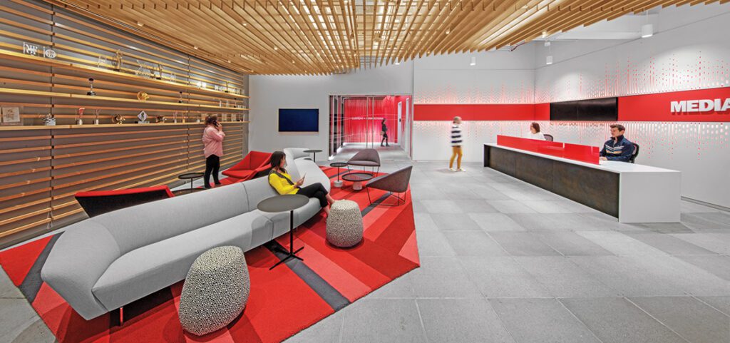 With architecture by Pickard Chilton, the ground-up headquarters is composed of two office towers (10 and 17 stories tall) joined by a five-story podium, which houses the lobby, amenities, and parking. HOK was at the table from the beginning and helped shape some of the architectural solutions, especially in the podium. The parking deck constrained the volume that would become the lobby, which could have been one to three stories high. “We studied different options and how the floors wove together,” Polucci says. The team landed on a 32-foot-high lobby that’s open to loungelike collaboration zones on the second floor and creates energy and buzz. This gave HOK the opportunity to create a monumental circular stair, the defining element of the interior.